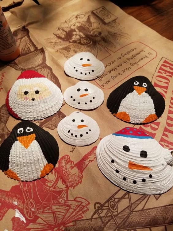 Jednostavne školjke možete pretvoriti u šarmantne božićne likove poput snjegovića, pingvina i Djeda Mraza! Ovi preslatki oslikani dizajni unose razigrani dodir u vaš blagdanski dekor, dodajući toplinu i kreativnost svakom prostoru.