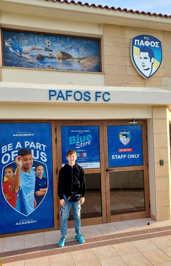 Čim se izađe iz lokaliteta Grobnice kraljeva kod rotora, nalazi se nogometni klub Pafos u kojem igra Oršić. Naletili smo na nogometaše omladince koji su čekali prijevoz do treninga. Upoznali smo Kristijana iz Crne Gore s kojim smo kratko popričali. Kako smo pitali gdje možemo kupiti dresove, rekao je da će nam dati iz kluba i tako je Mai dobio trening dresove. Može li bolja uspomena biti 😊.