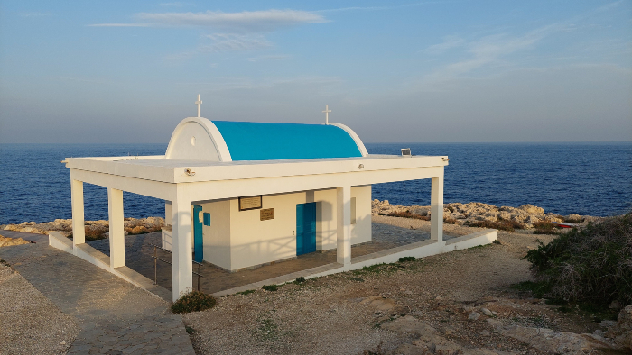 Odmah u blizini je crkvica Agioi Anargyroi koja stoji tik iznad mora. Jednostavna bijela kapelica koja djeluje kao da čuva cijeli rt. Odmah pokraj nje spuštaju se strme metalne stepenice koje vode do male platforme uz samo more. Tu valovi neprestano udaraju o stijene i najbolje se osjeti koliko je obala na Cape Grecu divlja i izložena. Taj kontrast između tihe kapelice na vrhu i snažnog udaranja mora ispod daje cijelom mjestu poseban dojam.