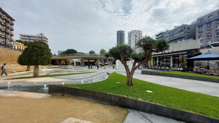 Prošetali smo i po grčkom dijelu Nikozije koju nismo obišli 2013. Veliki moderan Trg Eleftheria (Trg slobode) s parkom izgrađen je unutar povijesnih zidina koje označavaju granicu između povijesnog dijela grada i novih četvrti. Sam tr i park je prostorno je organiziran na nekoliko razina. Nama se svidio. Sve klupe su moderne, izgledom podsjećaju na surferske daske, samo šta su kamene pa po zimi nije najtoplije sjediti na njima.